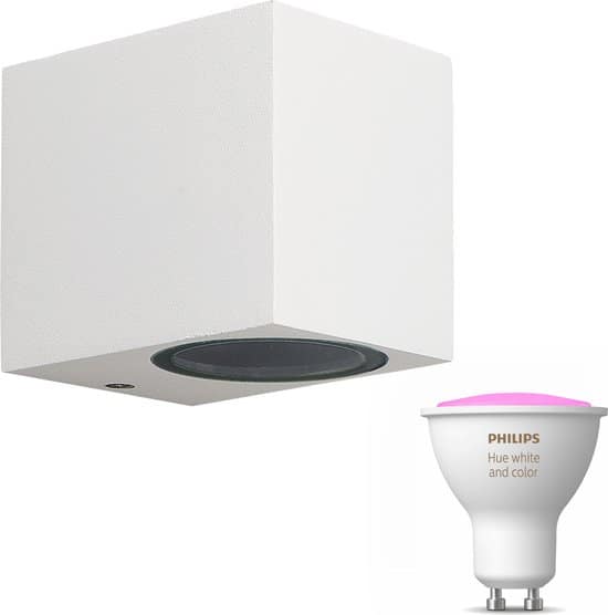 De witte, vierkantige Kandachu wandlamp is geschikt voor het verlichten van gevels buiten. De wandlamp heeft een GU10 fitting en is geschikt tegen regen. Slimme verlichting Wordt geleverd inclusief Philips Hue White and Color Ambiance GU10 lamp (Gekleurd + wit licht)…